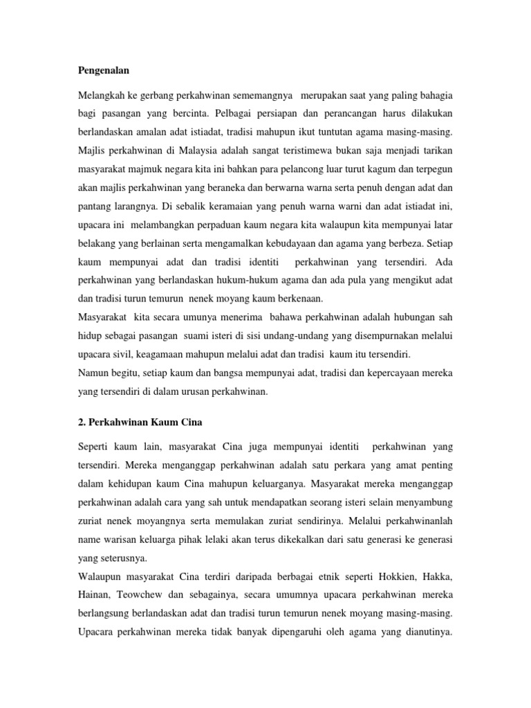 Kami kongsikan adat resam dan budaya masyarakat cina dalam upacara perkahwinan. You are on page 1 of 13. Perkahwinan penting untuk mengekalkan institusi keluarga dan melaluinya keturunan nenek moyang dapat diteruskan daripada satu generasi kepada generasi yang lain. Orang hakka memandang sangat penting tentang pernikahan karena itu adat pernikahan orang hakka sangat rumit dan banyak kujia atau prosesi menangis mempelai wanita hakka merupakan salah satu diantara adat tersebut.