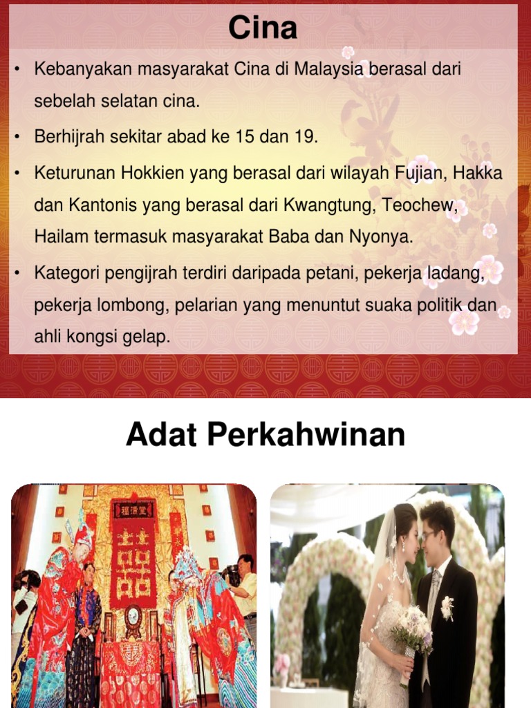 Adat resam dan pantang larang ini diamalkan secara berbeza beza mengikut kaum kaum tertentu dalam masyarakat cina namun apa yang diterangkan seperti berikut merangkumi adat resam masyarakat cina secara. Adat resam perkahwinan kaum cina. Adat perkahwinan kaum cina. Isi kandungan muka surat pendahuluan 1 perayaan bangsa cina 1 perkahwinan cina 5 kematian orang cina 14 makanan orang cina 17 pemakaian kaum cina 21 agama dan kepercayaan kaum china 24 kesimpulan 34 3.