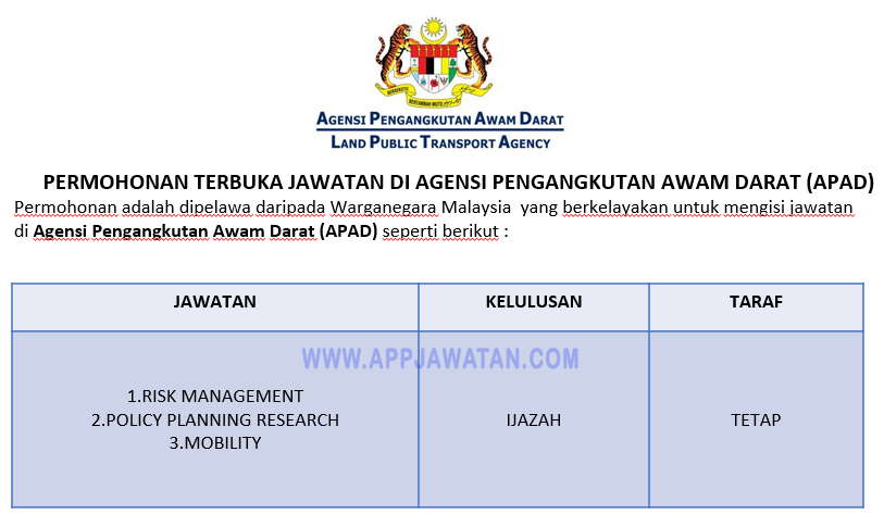 Kekosongan Terkini Di Agensi Pengangkutan Awam Darat Apad Jobkini Com Jawatan Kosong Swasta Glc Dan Kerajaan Terkini