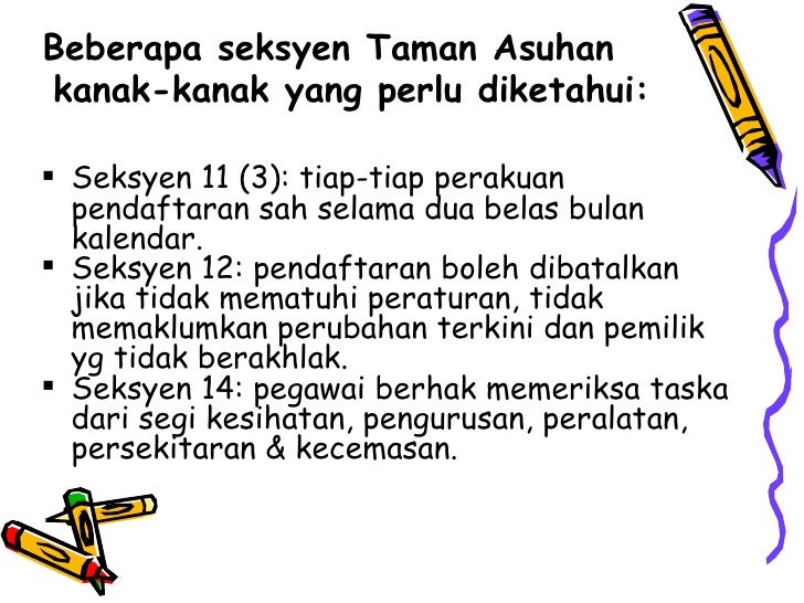Akta taman asuhan kanak kanak 1984 akta 308 tujuan penggubalan adalah untuk mengadakan peruntukan bagi pendaftaran pemeriksaan dan penguatkuasaan ke atas taska dan bagi perkara yang berkaitan dengannya demi menentukan kesejahteraan keselamatan dan perkembangan menyeluruh kanak kanak diutamakan. Akta taman asuhan kanak kanak 1984 suatu akta untuk mengadakan peruntukan bagi pendaftaran pengawalan dan pemeriksaan taman asuhan kanak kanak dan bagi maksud yang berkaitan dengannya. Akta taman asuhan kanak kanak 1984 akta 308 suatu akta untuk mengadakan peruntukan bagi pendaftaran pengawalan dan pemeriksaan taman taman asuhan kanak kana slideshare uses cookies to improve functionality and performance and to provide you with relevant advertising.