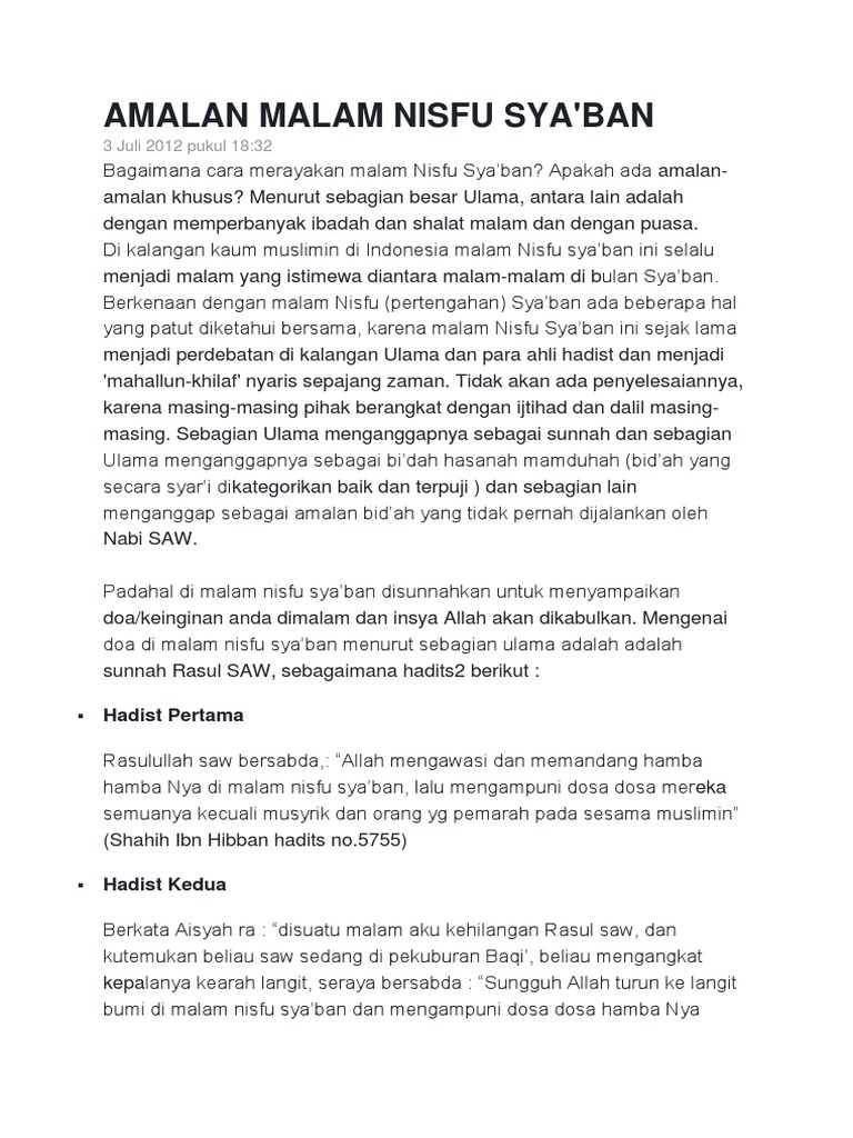 Bagaimanapun umat islam dinasihatkan supaya tidak terpengaruh dengan pelbagai kelebihan mahupun ganjaran yang menanti jika mengerjakan amalan amalan tertentu ataupun dikhaskan pada malam nisfu syaaban yang kononnya berpandukan hadith terutamanya menerusi bacaan di internet. Amalan malam nisfu syaaban a. Setelah selesai solat sunat ba diyah maghrib atau isyak bacalah surah yasin 3 kali dengan setiap satunya diniatkan memohon. Tarikh kelebihan dan panduan amalan malam nisfu sya ban adalah merupakan antara malam yang mempunyai kelebihan dan keistimewaan.