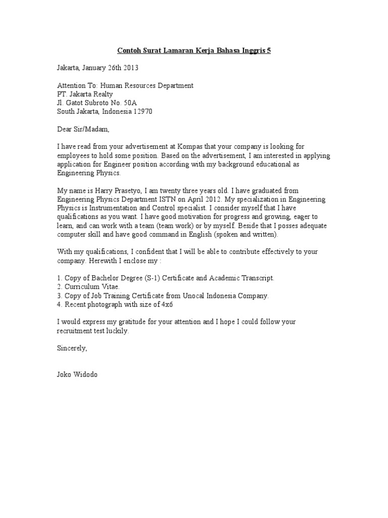 Contoh Surat Lamaran Kerja Bahasa Inggris 5 Doc Learning Cognition