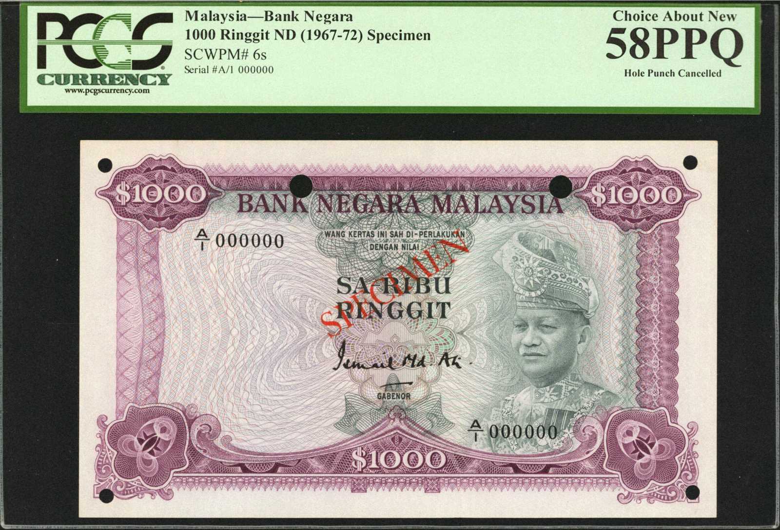 Malaysia Bank Negara Malaysia 1000 Ringgit Nd 1967 72 P 6s Specimen Pcgs Currency Choice About New 58 Ppq Stacks Bowers