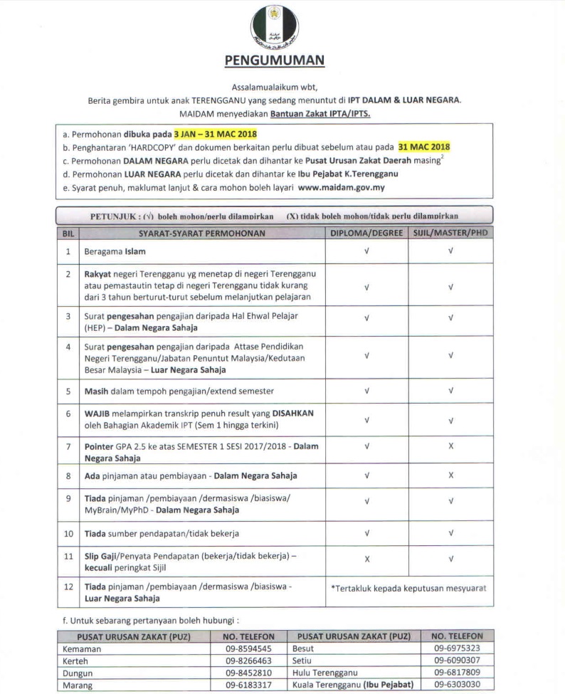Permohonan Bantuan Zakat Maidam Terengganu Dibuka Bermula 3 Julai Hingga 31 Ogos 2017 Waktu Solat Dot Net