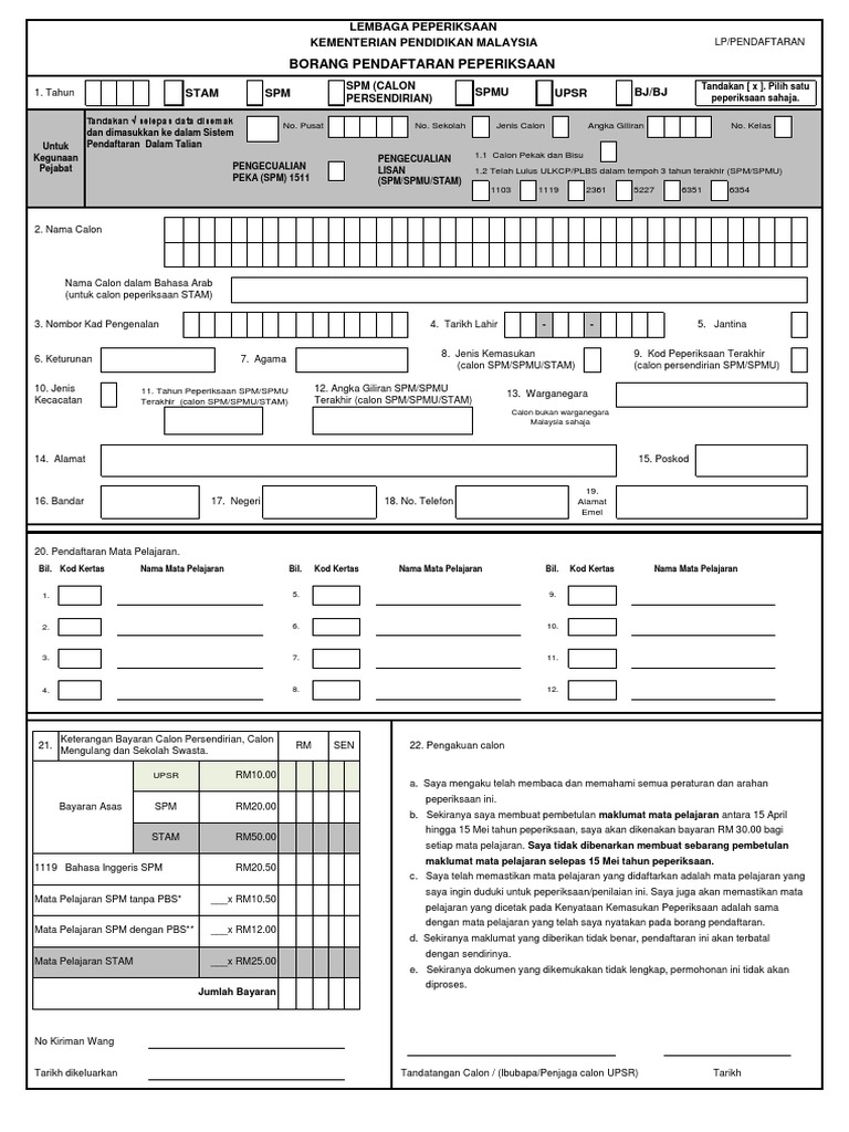 Borang pendaftaran calon sekolah spm 4. Kod kertas tarikh dikeluarkan upsr rm10 00 nama mata pelajaran no kiriman wang rm20 50 mata pelajaran spm tanpa pbs x rm10 50 14. Borang calon cacat b.
