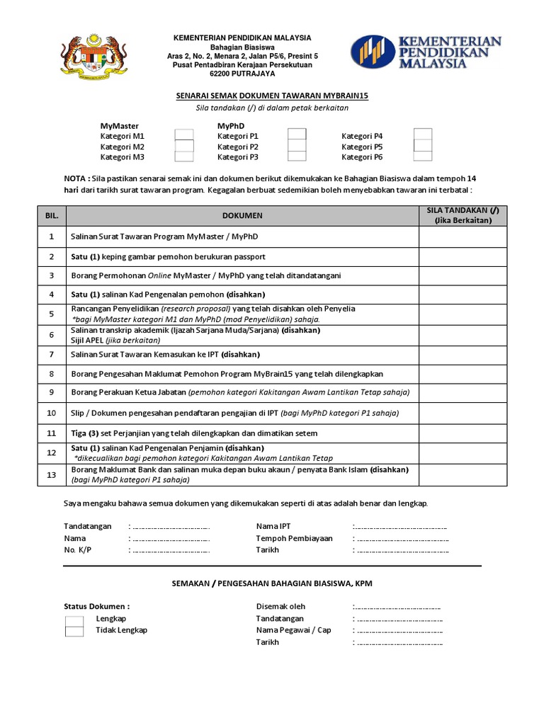 Https Biasiswa Mohe Gov My Mybrain15 V2 Doc Borang Senarai 20semak 20dokumen 20tawaran 20mybrain15 Pdf