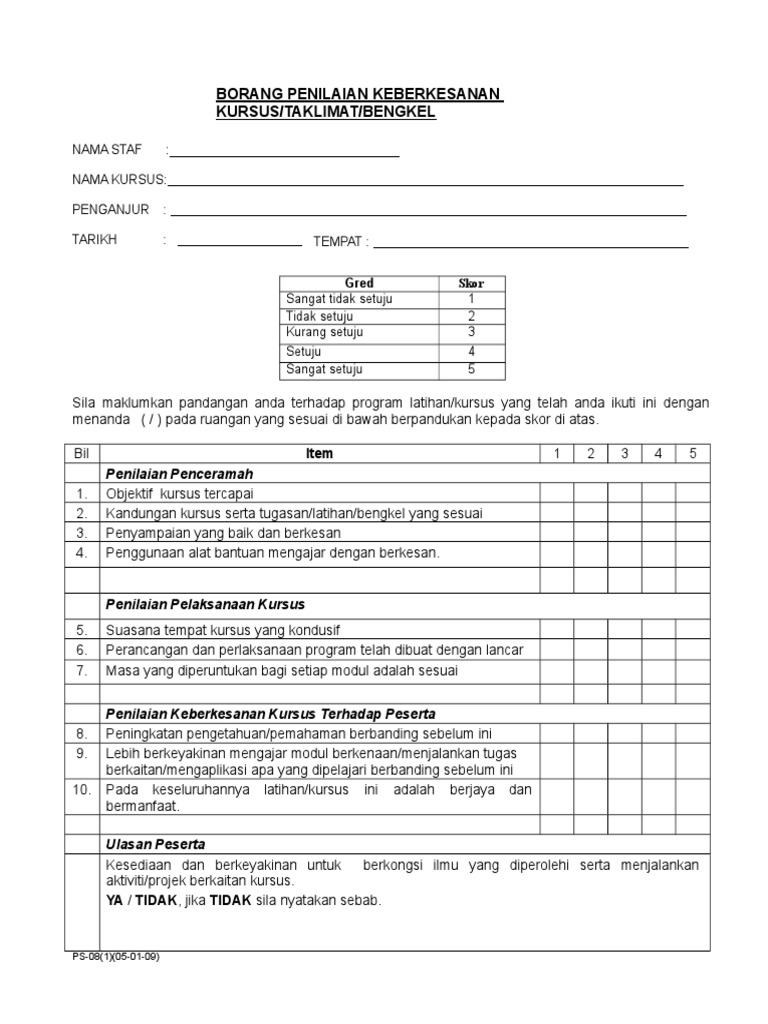 Borang Soal Selidik Kajian Penilaian Keberkesanan Kursus Dalam Pdf Document