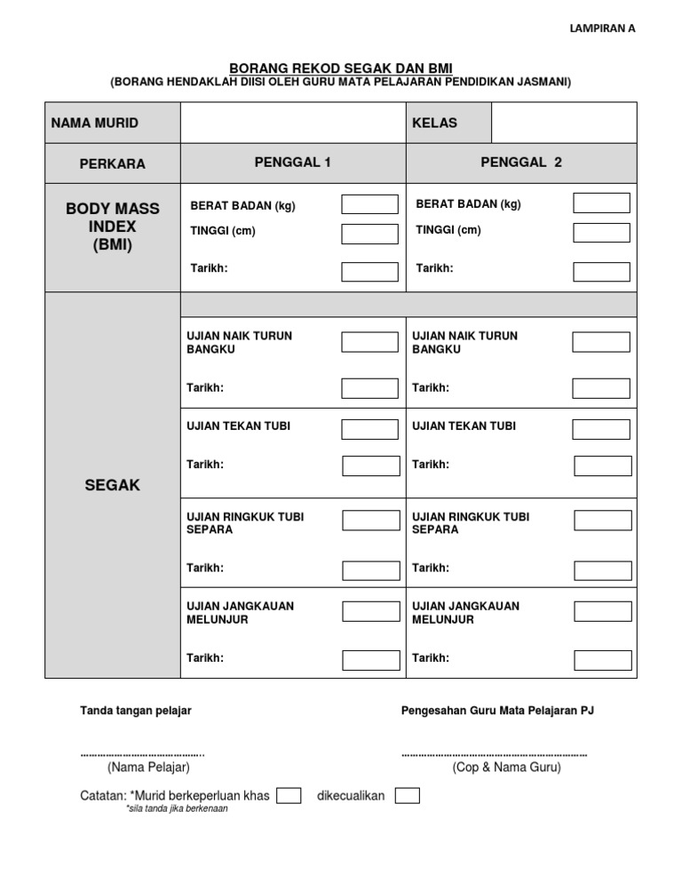 Doc Borang Rekod Segak Dan Bmi Borang Hendaklah Diisi Oleh Guru Mata Pelajaran Pendidikan Jasmani Simson Damus Academia Edu