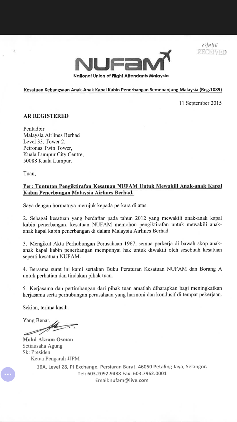 Charles Hector Wrong Address A Lame Reason For Denying Recognition Of Malaysian Airlines Flight Attendants Union