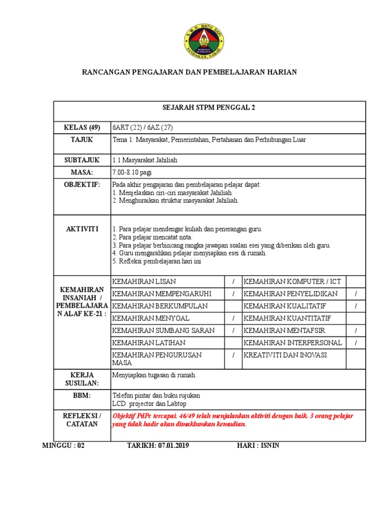 Rancangan Pengajaran Dan Pembelajaran Harian Sejarah Stpm Penggal 2 Kelas 49 Tajuk Subtajuk Masa Objektif