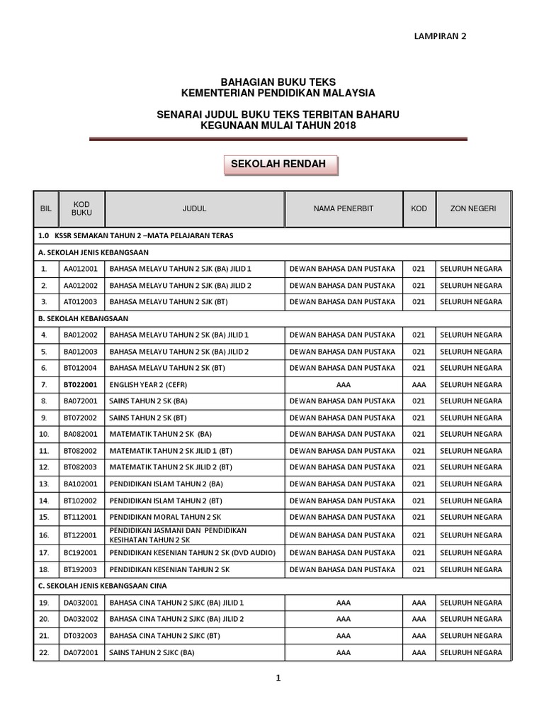 Lampiran A Senarai Buku Teks Terbitan Baharu Btb Kegunaan Mulai T