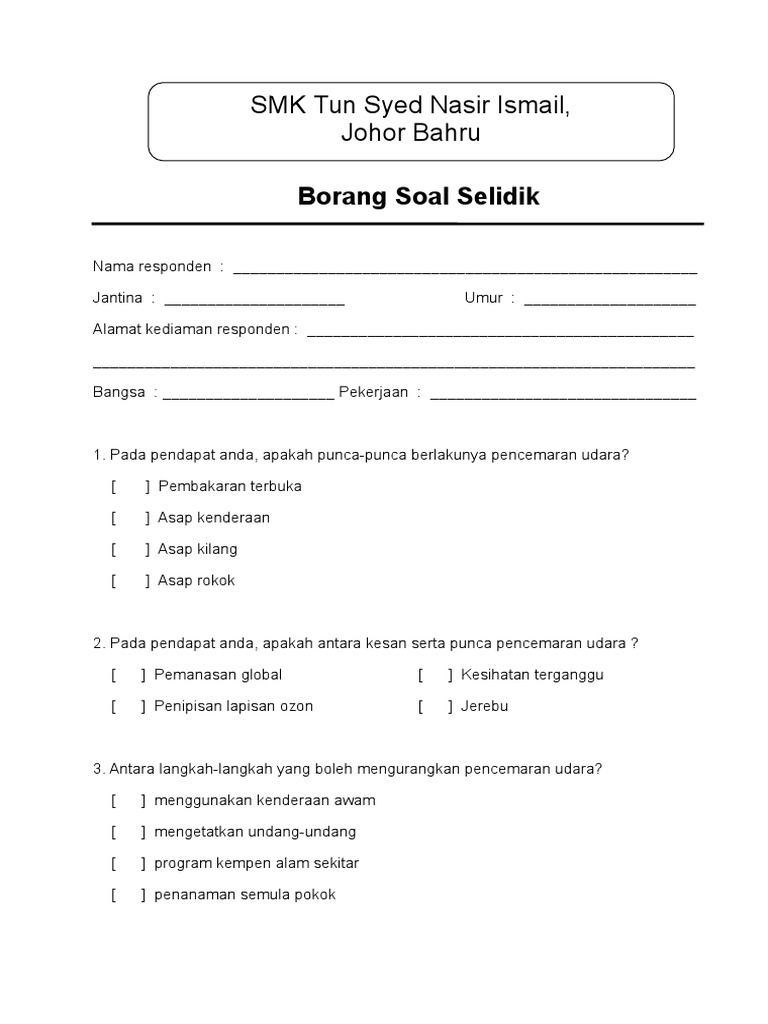 Contoh Soalan Soal Selidik Pencemaran Udara Arasmi