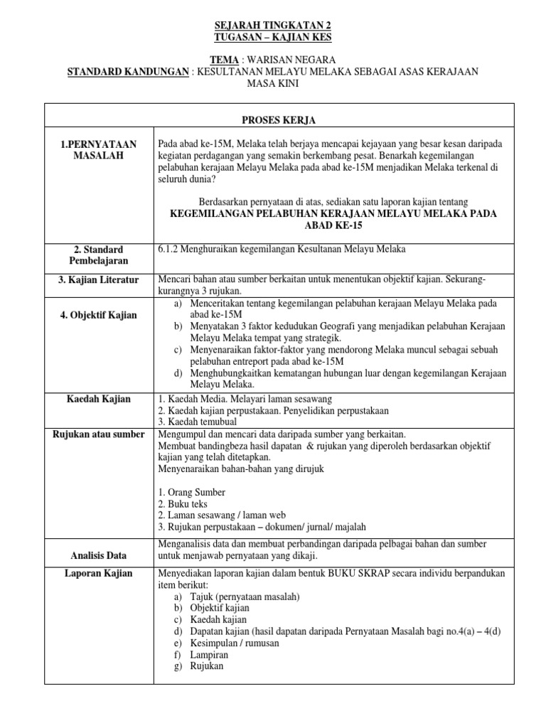 Contoh kaedah kajian kesultanan melayu melaka tingkatan 2. Assalamualaikumnama saya rahayu mazuin dari 2 al farabi ini hasil kajian kes sejarah saya saksikanlah kesultanan melayu melakajadual kerja132perancangan jadual kerja objektif kajian kaedah kjian tajuk proses awalmenyediakan kerangka kasar penulisan465pelaporan pengenalan menjelaskan ciri ciri lokasi yg strategik yang dipilih oleh parameswara menyenaraikan faktor kegemilangan kesultanan. Ini akan dapat membantu saya membuat satu kajian ilmiah dengan tatacara yang betul jelas dan tepat dan berguna kepada saya untuk tahap pengajian yang lebih tinggi kelak. Bab 5 tingkatan 2 pengasasan kesultanan melayu melaka draft. Pengangkutan awam di taman tun syed nasir tanjung agas tangkak johor disediakan oleh.