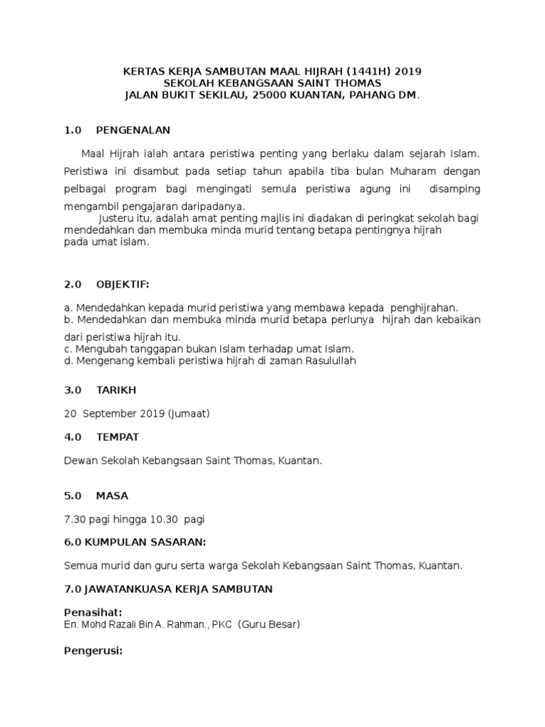 Contoh Kertas Kerja Sambutan Maal Hijrah Peringkat Sekolah