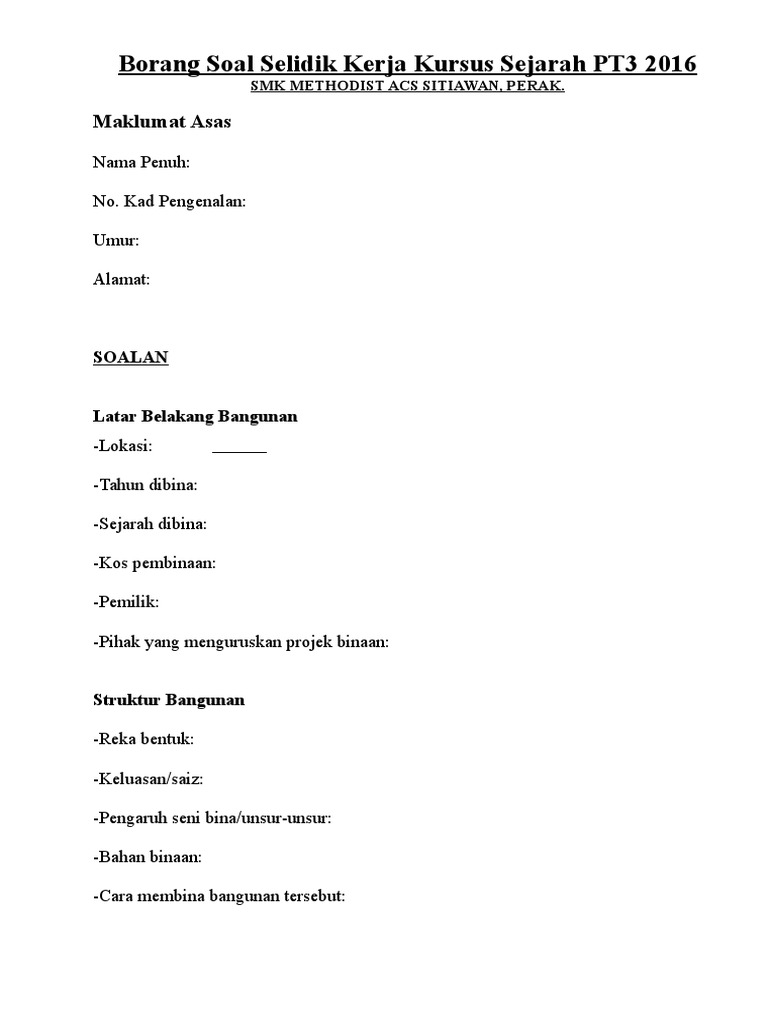 Umum sedia maklum yang pelajar tingkatan 3 tahun 2018 akan diberikan satu tugasan kerja kursus sejarah pt3 pelbagai instrumen berdasarkan kepada tajuk masyarakat di kawasan tempat tinggal anda. Tujuan membuat kerangka kasar adalah bagi memudahkan calon menulis mengolah laporan. Koleksi contoh folio sejarah pt3 2019 klik satu persatu paparan gambar di bawah ini. Ianya merupakan salah satu komponen pentaksiran bilik darjah pbd yang wajib dilaksanakan oleh murid tingkatan 3 di mana murid adalah dikehendaki membina penyataan masalah daripada.